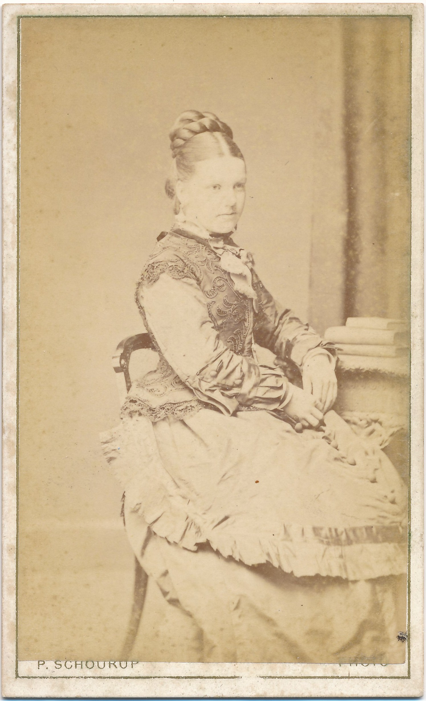 I have a photograph from my grandmother by P. Schourup and would like to identify it. It is of a young woman with her hair braided round her head in a dress with lots of lace and ribbon looking at a book on a chair. How do I identify it? CRJ