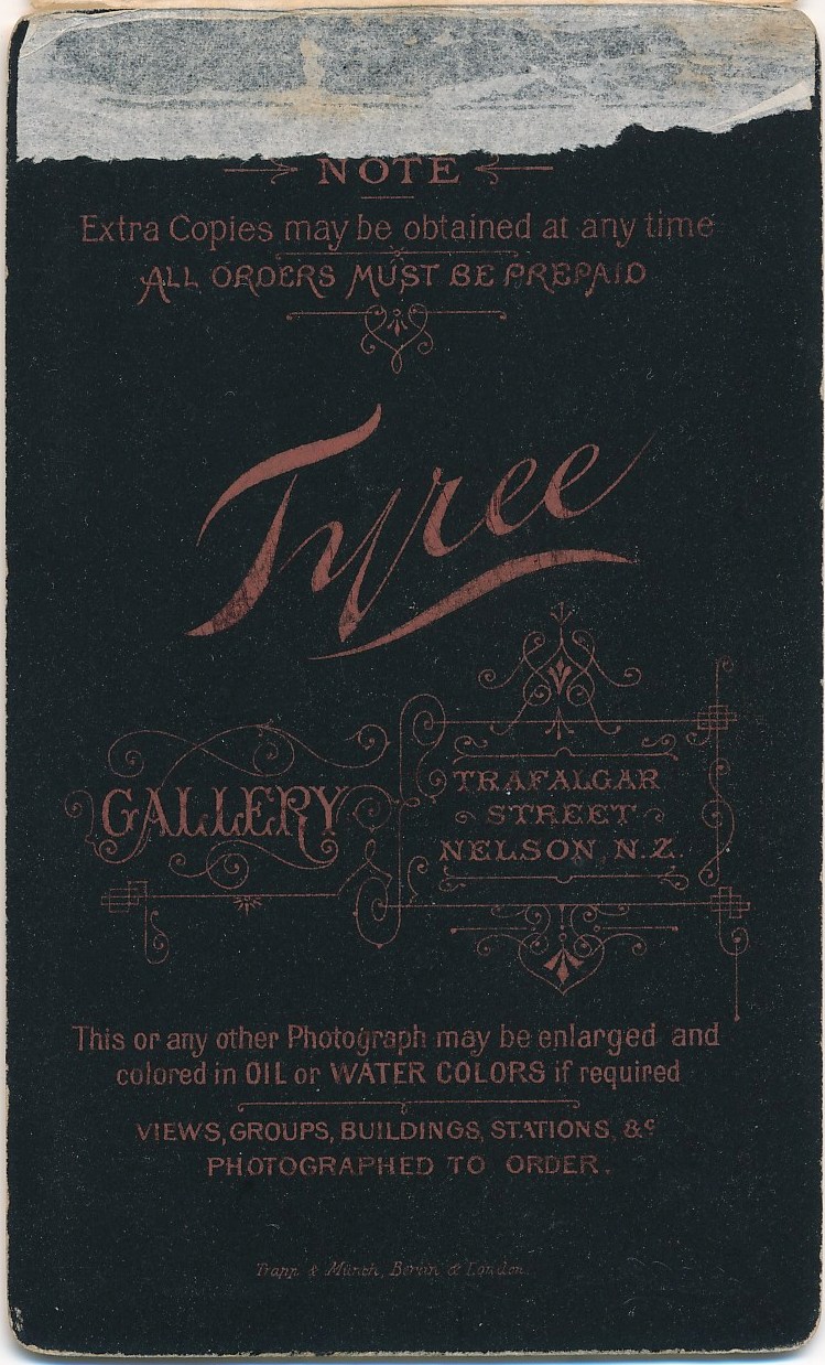 An early letter head lists 25 Tyree patents from Tyree Insect Death, to Tyree Refrigerator Paint Powder. He was also an early enthusiast for acetylene gas and calcium carbonate. He wanted to light Nelson with acetylene gas but councillors considered it too dangerous, and made him keep his supplies on the outskirts of the town. It is rather an interesting note that although William Tyree photographed thousands of people, it has taken years of searching by the Nelson Historical Society to positively identify a photo of William himself. Eventually one was found and it is not surprising that he is standing proudly beside his pride and joy—his acetylene generator. He was a man of many talents.His partnership with his brother Frederick did not last long as Frederick left in 1889 for Takaka where he set up as a photographer and he eventually left professional photography about 1906 to farm at Collingwood.