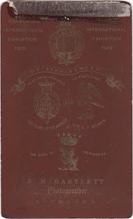 By appointment to His Royal Highness the Duke of Edinburgh, the Earl of Pembroke, the Marquis of Normanby, and the Governors of New Zealand. R. H. Bartlett, Artist Photographer, Queen-street, Auckland. First Order of Merit Sydney Exhibition, 1879, and Melbourne Exhibition, 1880-1. R.H.B. announces the completion of the alterations to his premises, and that the New Studio, together with the improved Appliances of the most modern construction, brought by him from Europe, enable him to produce every variety of Photographic Picture, in the most finished style of the art. He invites inspection of his establishment and the specimens of his work Portraits in oils and water colour are specialities; also the now circular opal plaques.